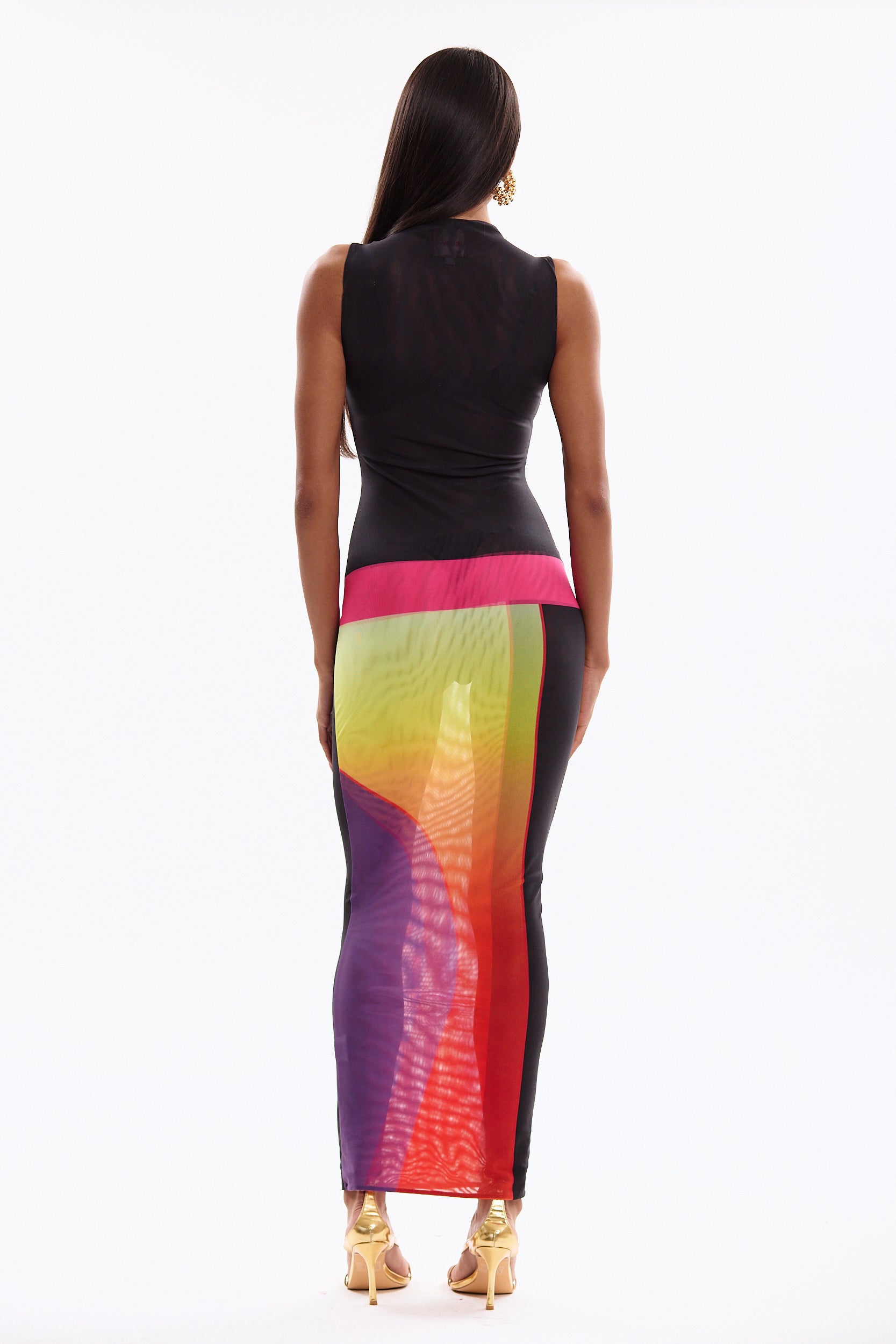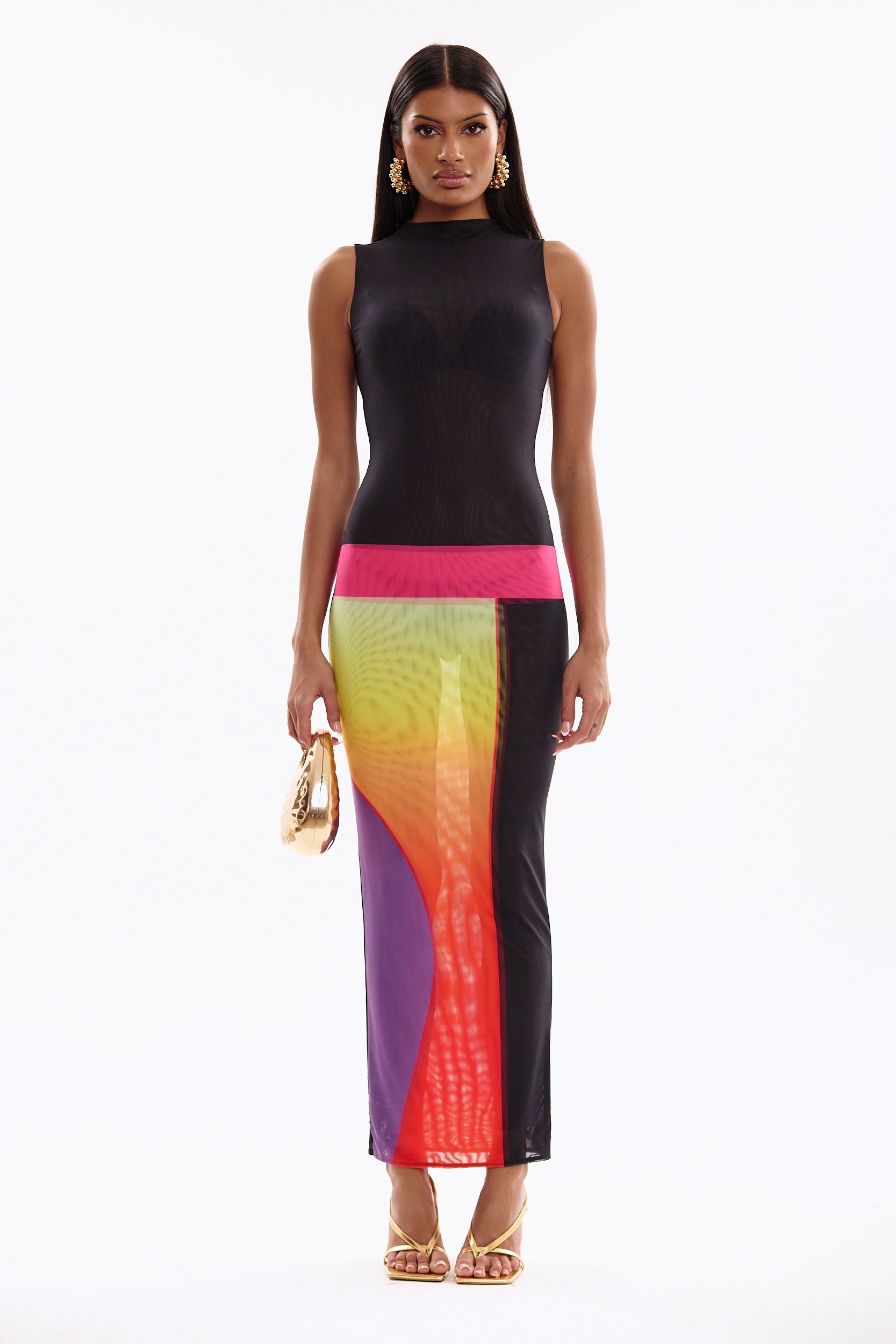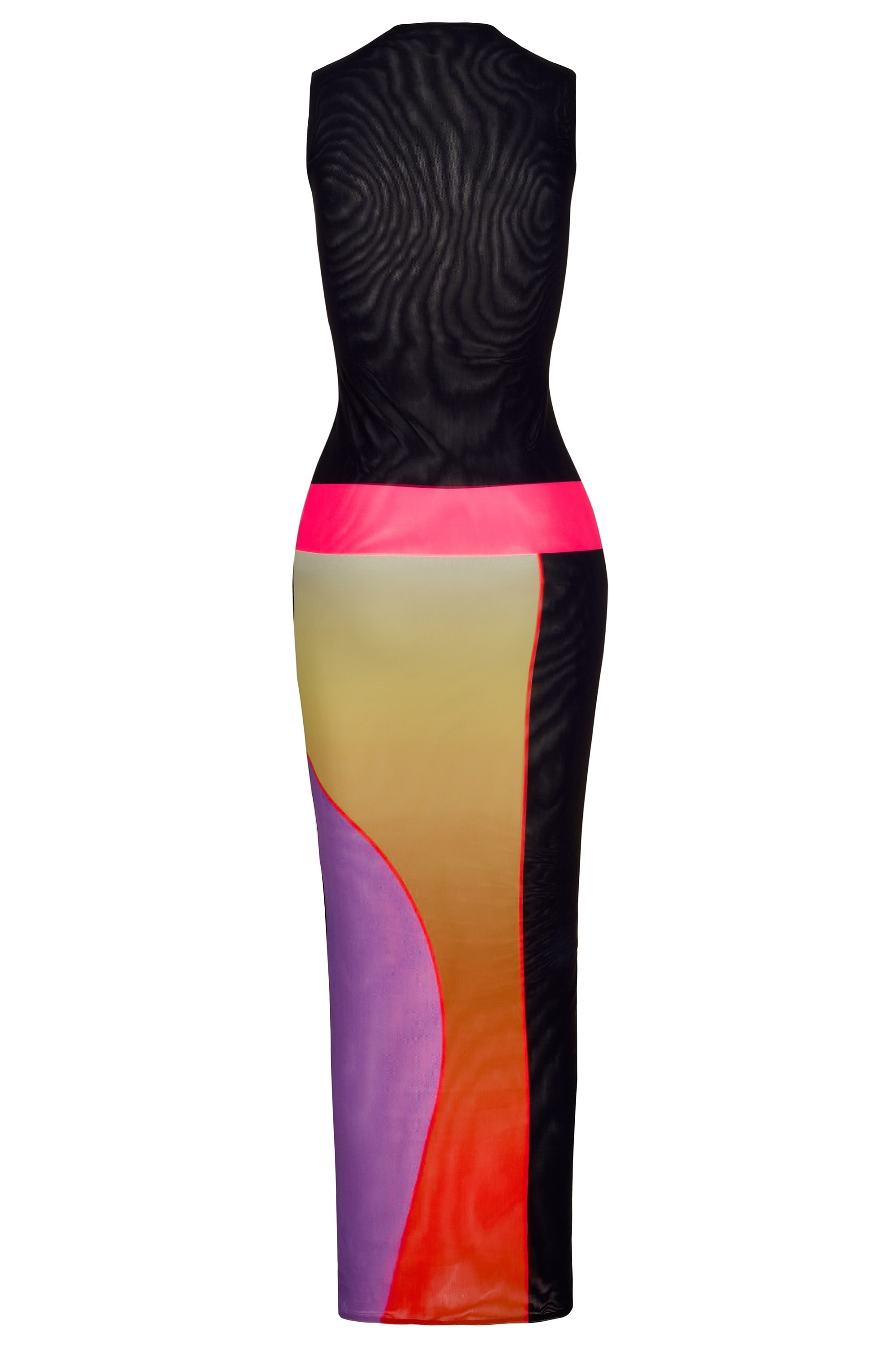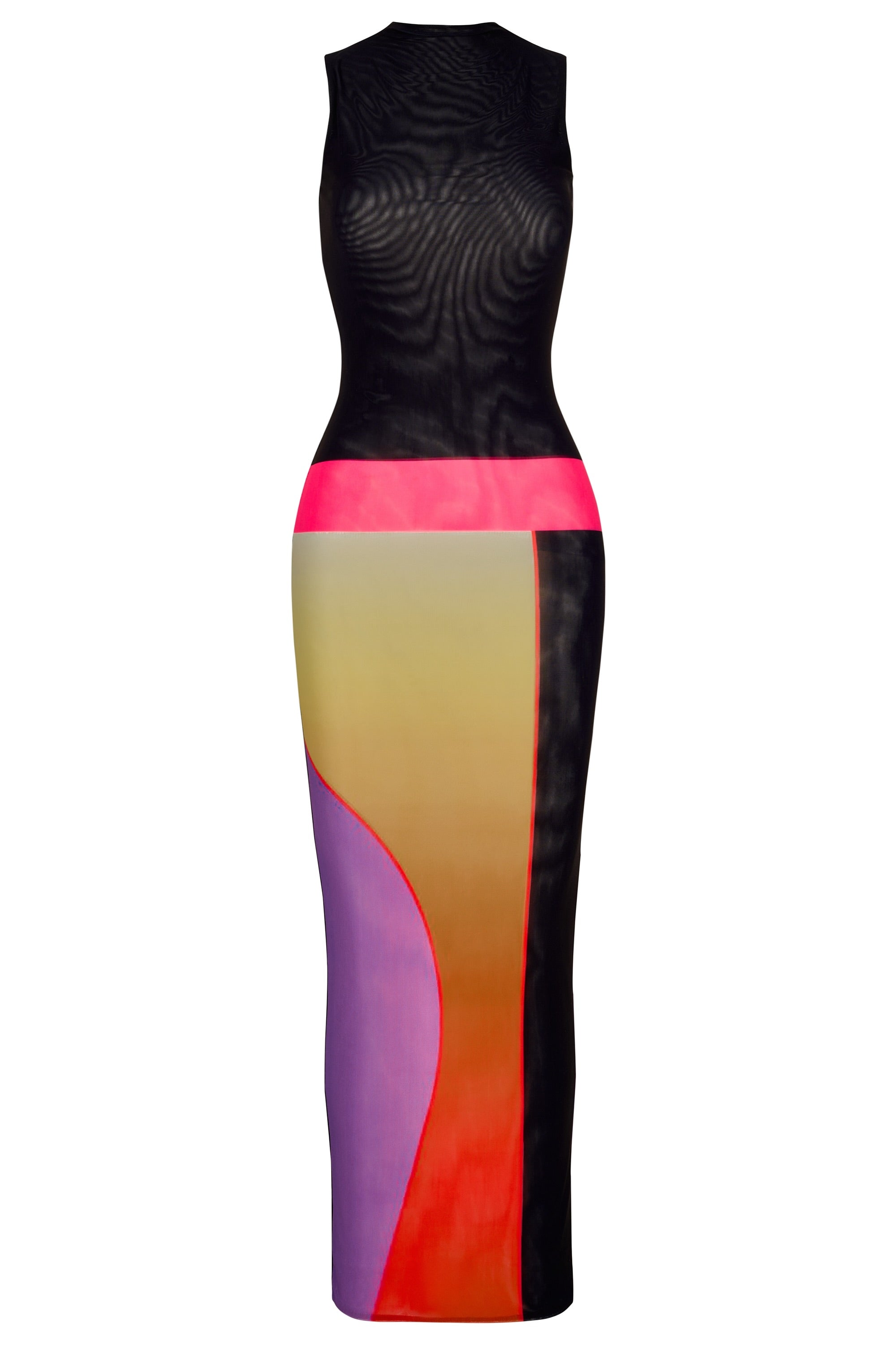 The Jade is a high neck sleeveless dress with an illusion drop waist and our brand new winter sunset print. The dress is slightly sheer, so it can be worn with shapewear to make it opaque.