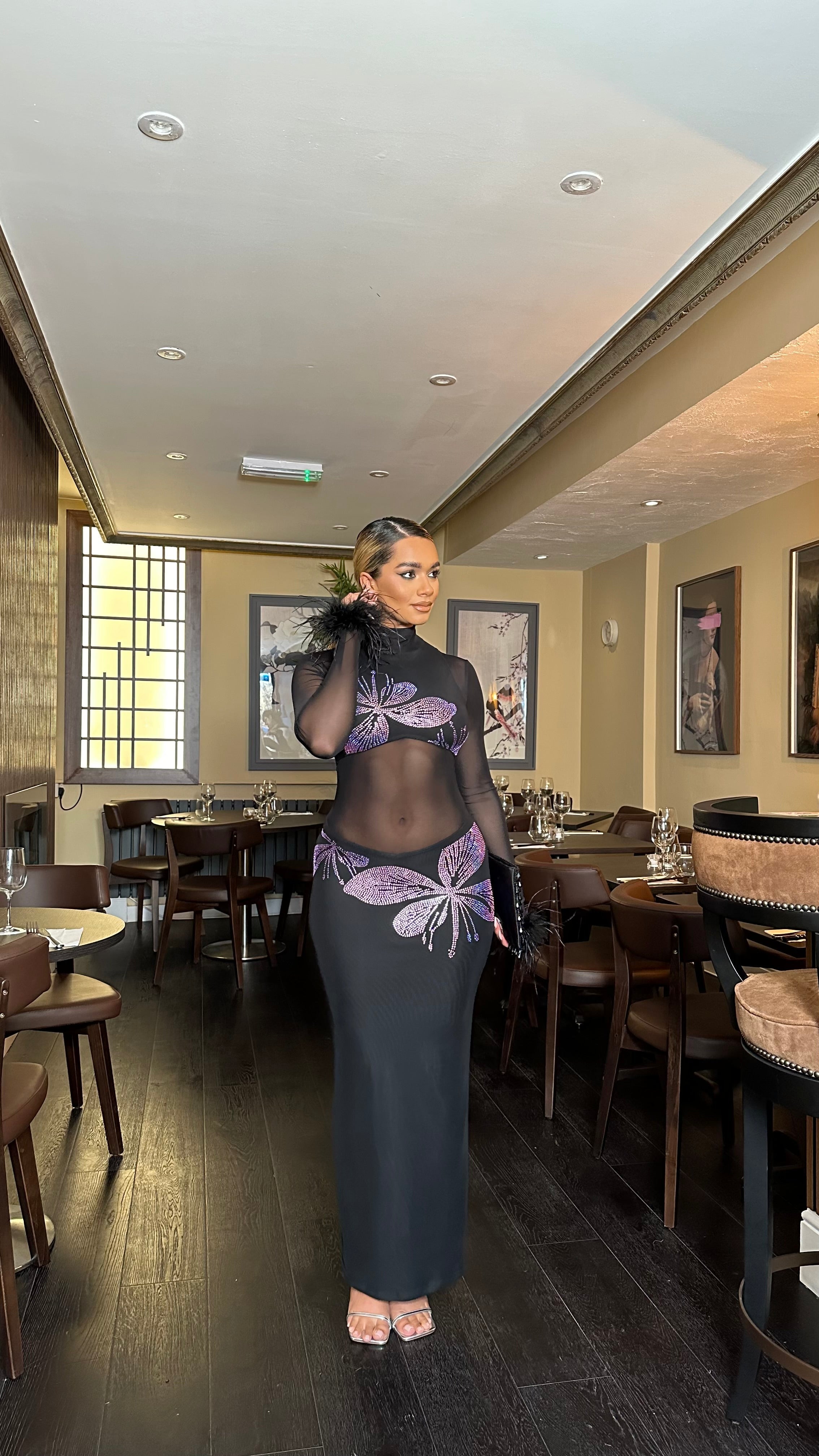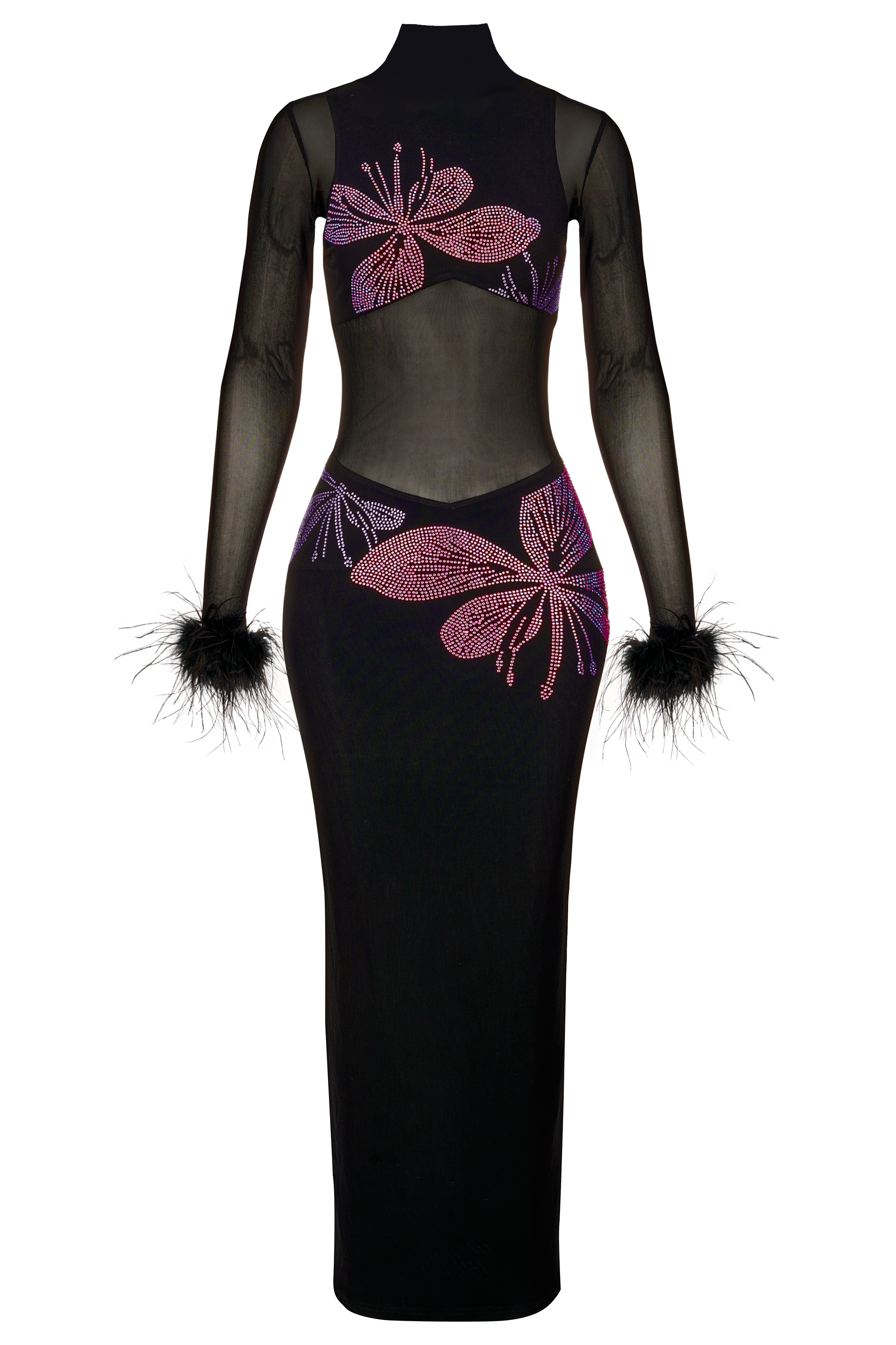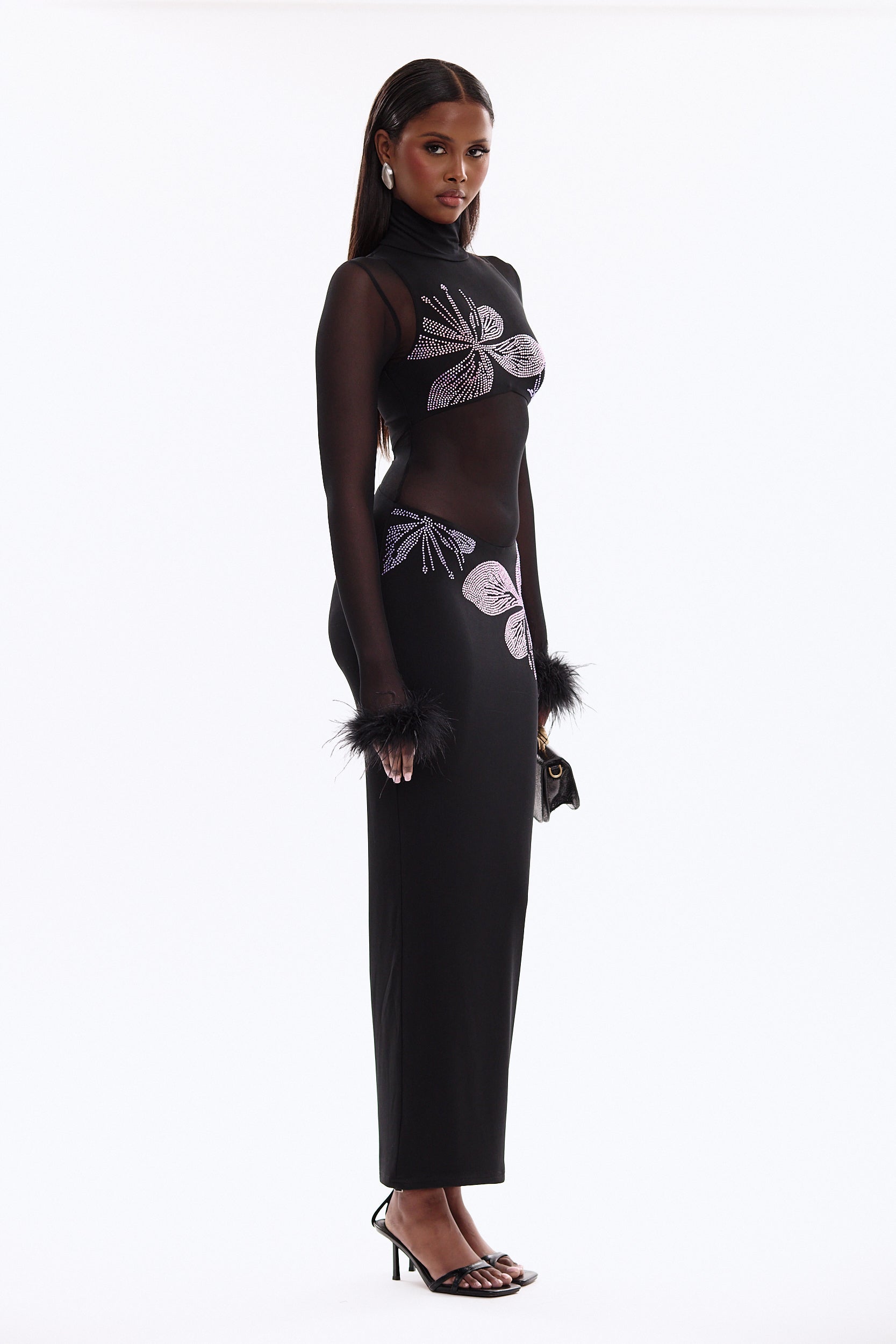 Introducing the Lana, our most glam dress to date!! Embellished with a signature Gbemi floral-inspired hotfix motif, guaranteed to make you sparkle. Featuring a sexy illusion cut out lined with premium mesh, if you are used to being best dressed, then we've just made the dress of your dreams! Made of high quality stretch jersey to accentuate your curves, and finished off with gorgeous feathered cuffs.