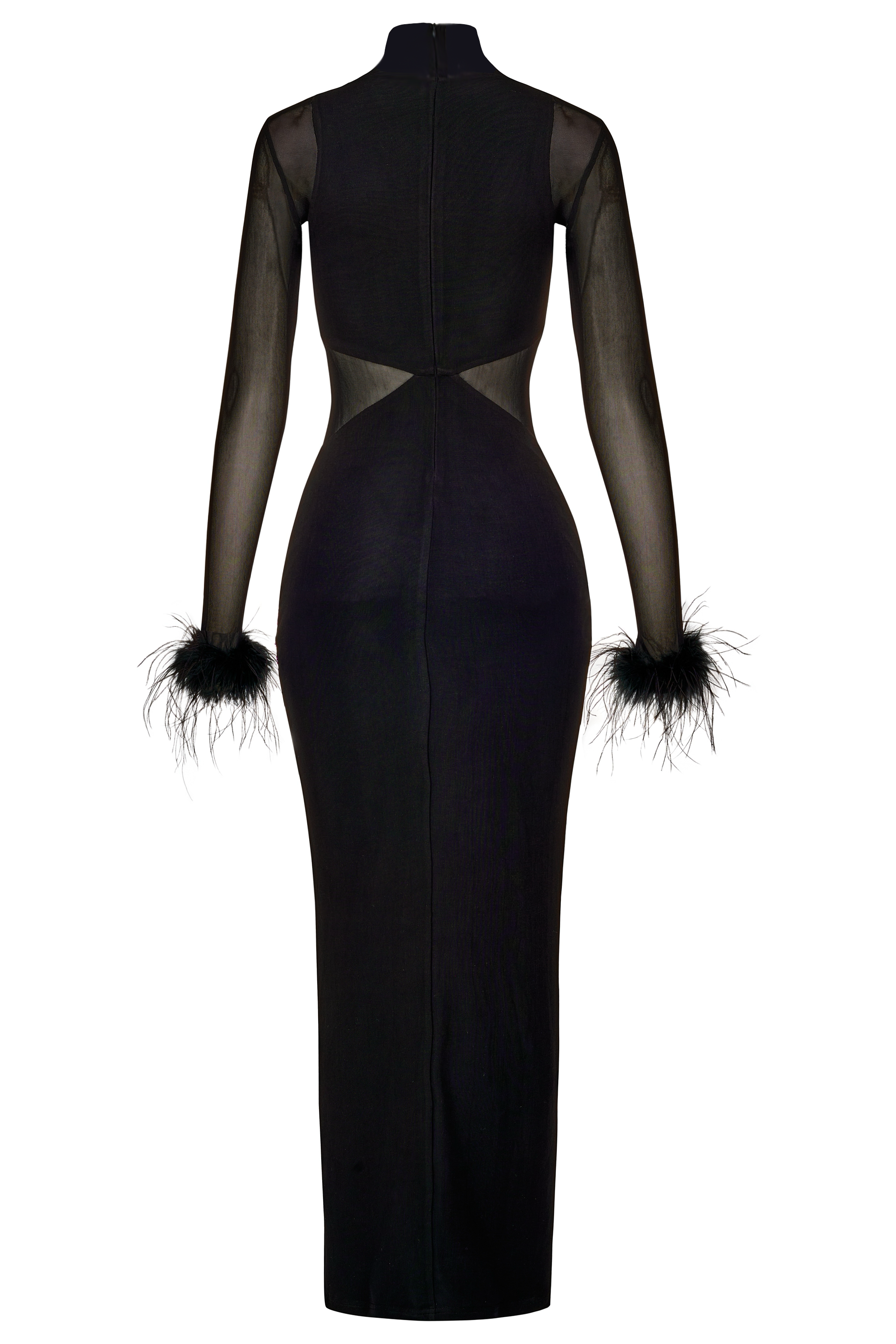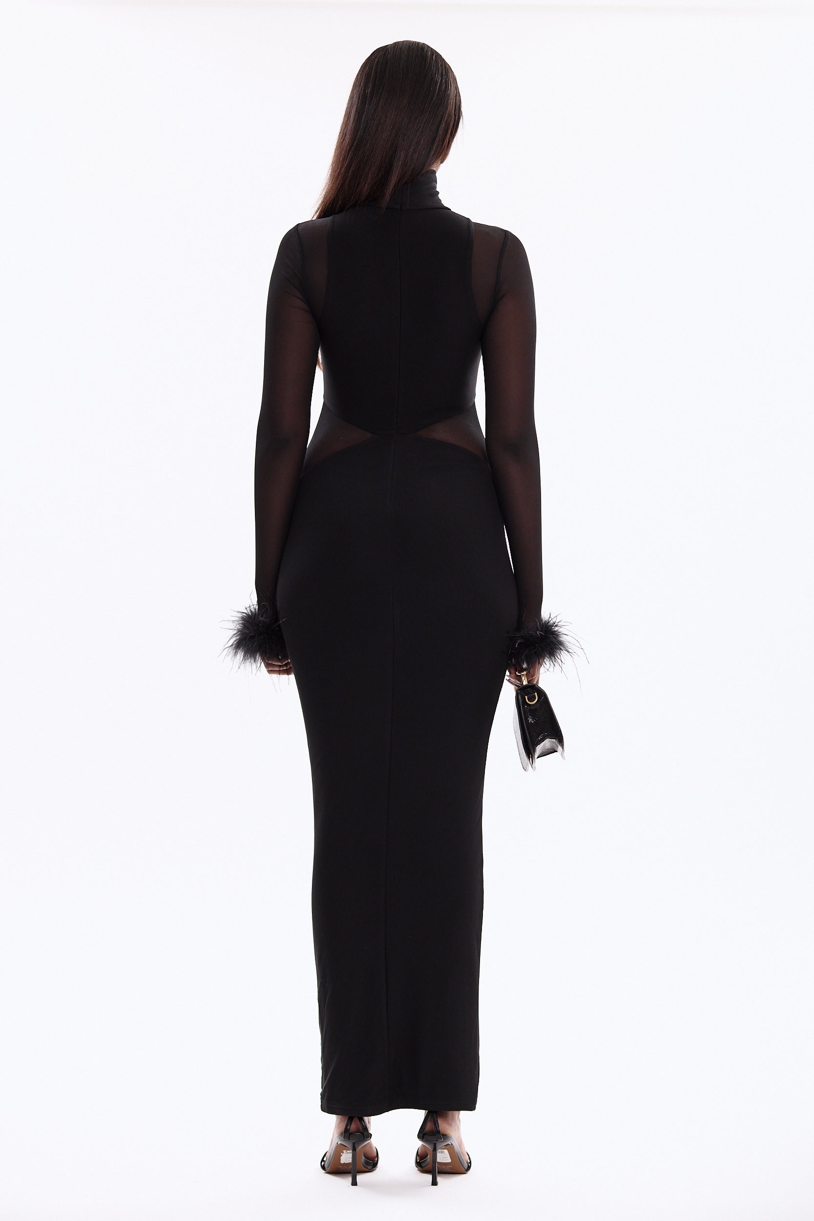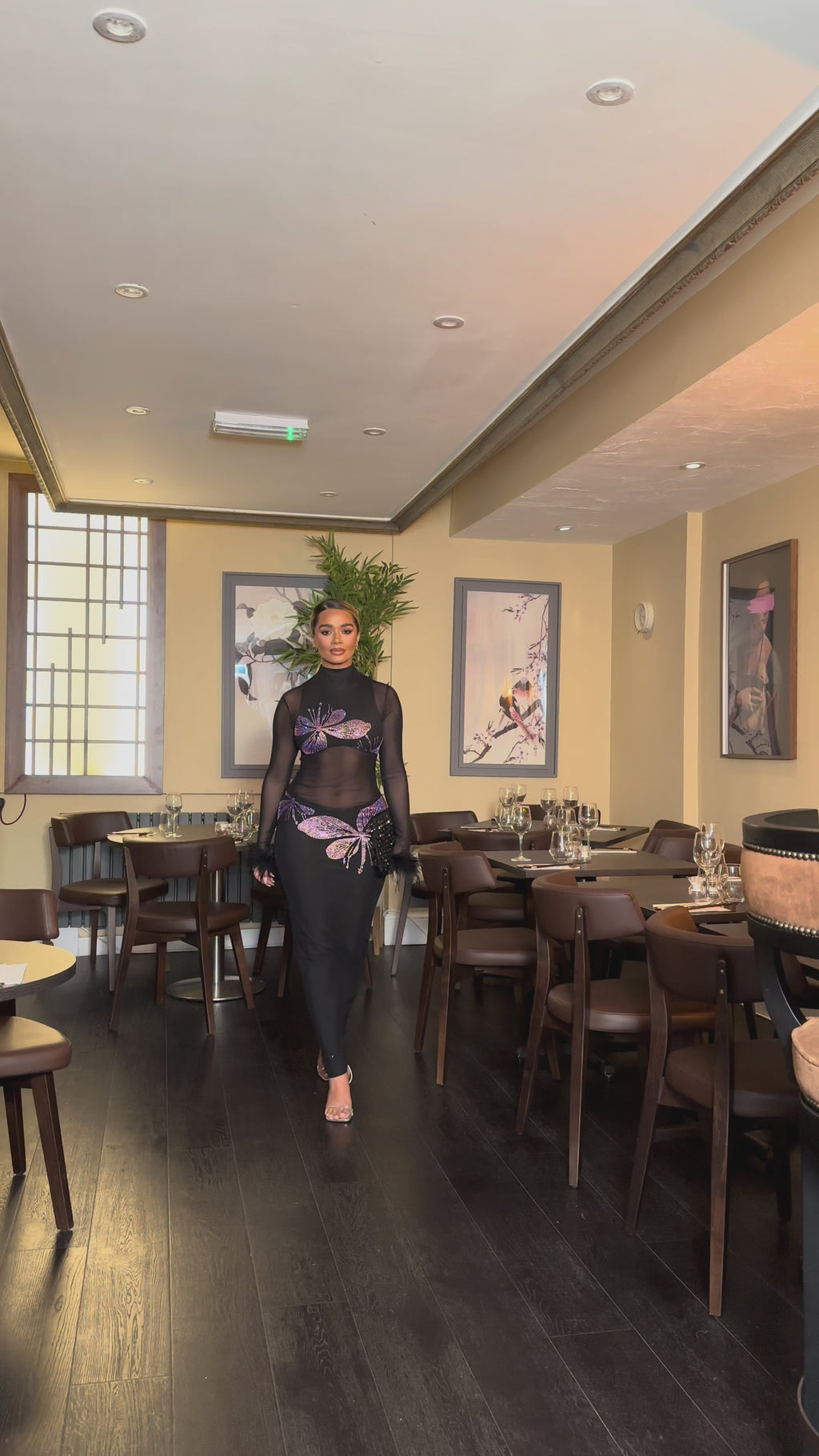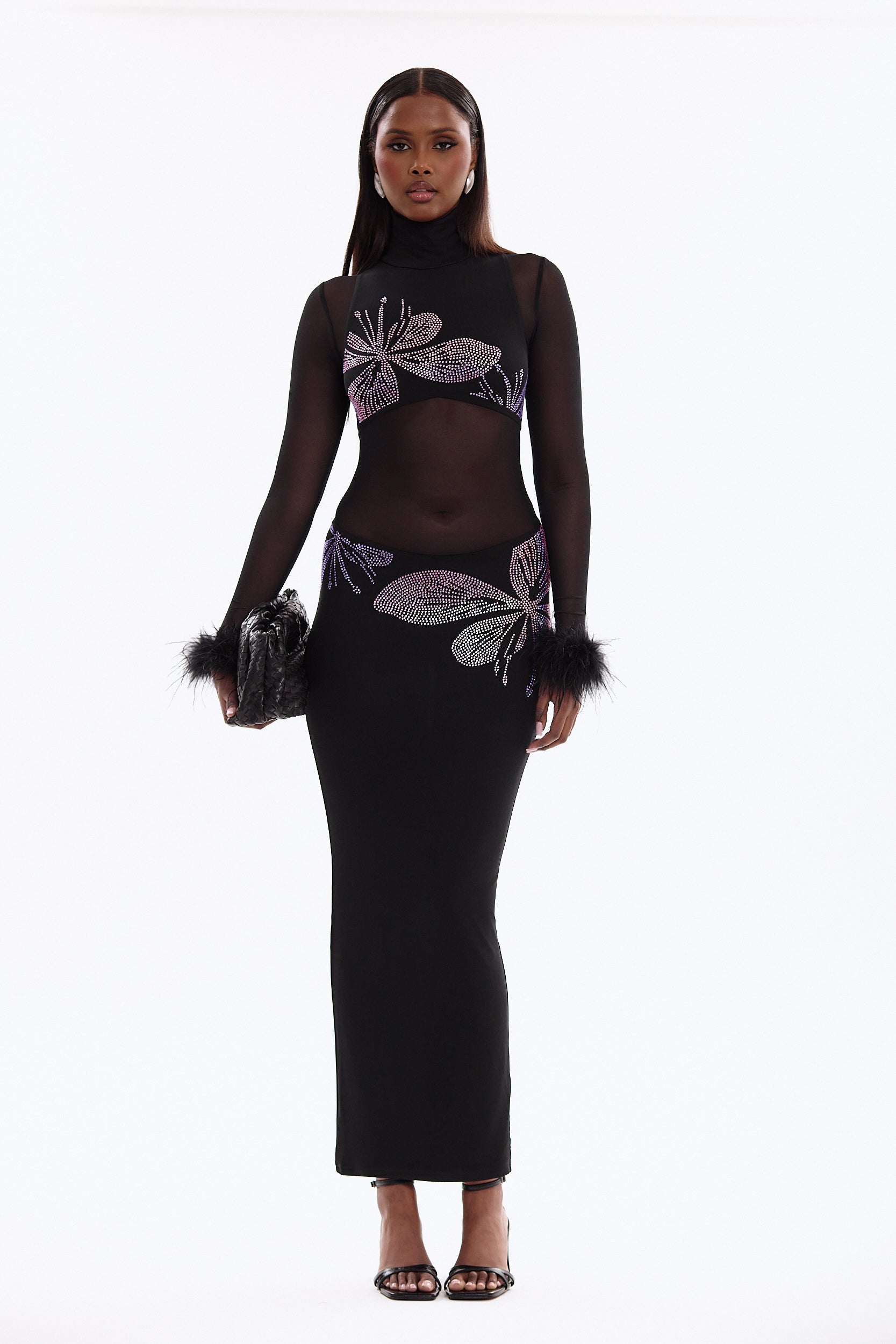 Introducing the Lana, our most glam dress to date!! Embellished with a signature Gbemi floral-inspired hotfix motif, guaranteed to make you sparkle. Featuring a sexy illusion cut out lined with premium mesh, if you are used to being best dressed, then we've just made the dress of your dreams! Made of high quality stretch jersey to accentuate your curves, and finished off with gorgeous feathered cuffs.