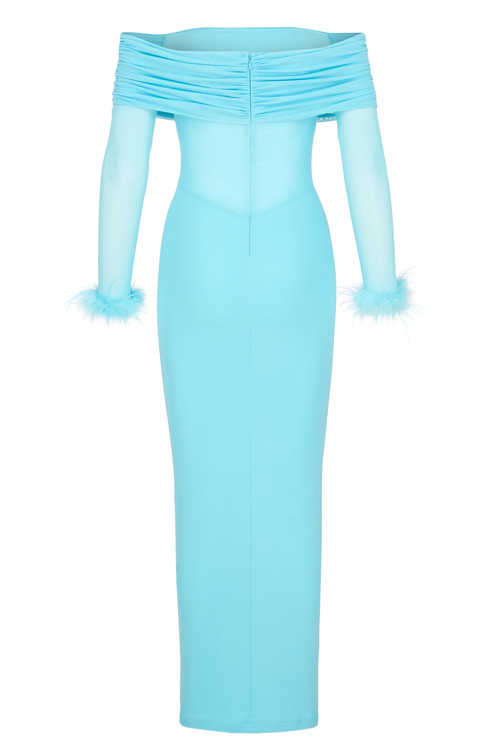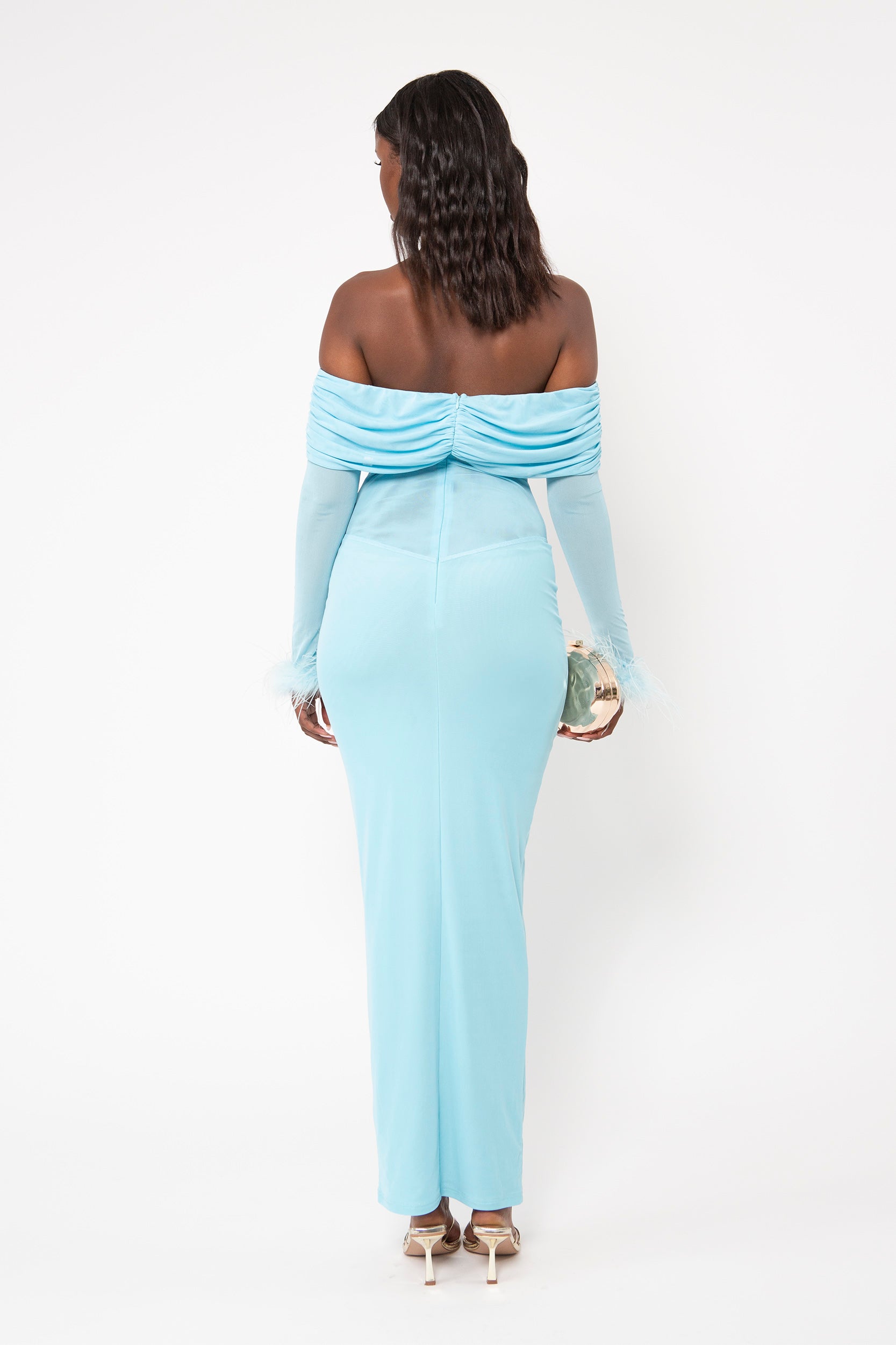 The Cassandra Dress is crafted from our premium aqua blue mesh and jersey. Designed to turn heads, it features dramatic feather cuffs and a sheer mid-panel that adds just the right touch of sexy, effortlessly making a statement wherever you go.